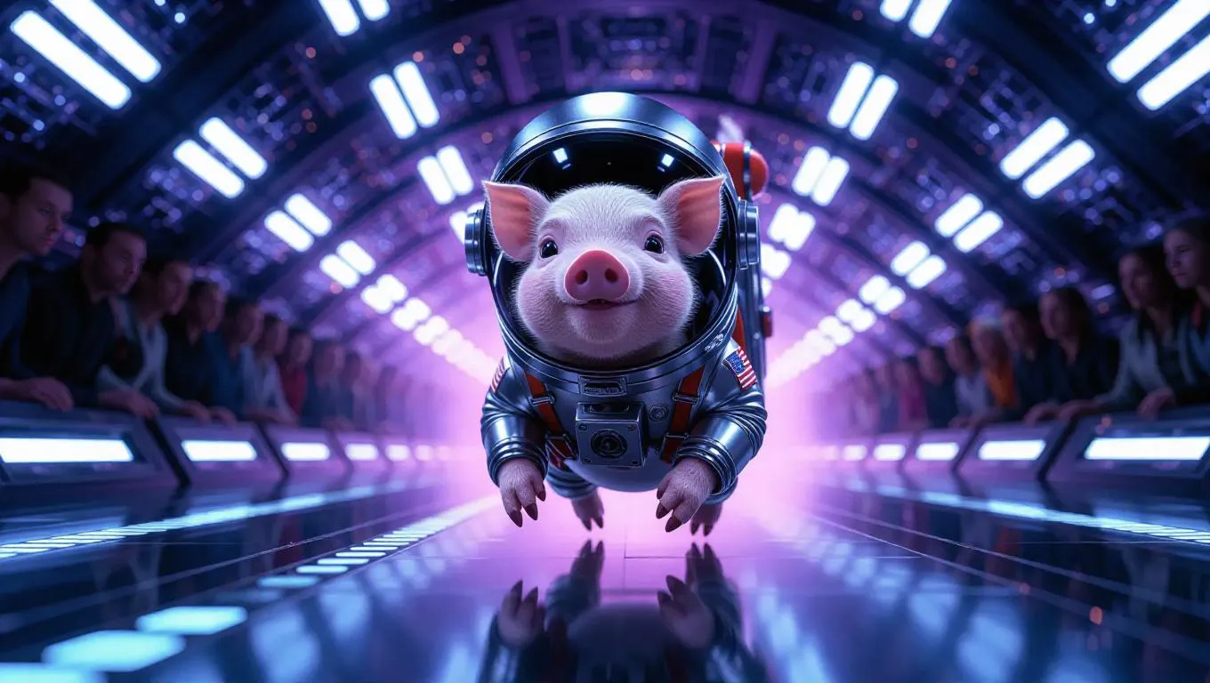 A tiny piglet trots down a cosmic-space runway, its curly tail swirling joyfully. It wears a shiny astronaut suit and a helmet, giving a futuristic and adventurous feel. The piglet's curious oinks and spirited snorts amaze the spectators.