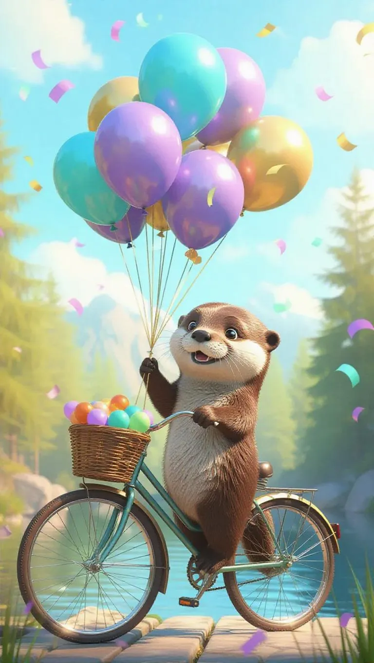 A cheerful cartoon scene featuring a cute otter selling colorful balloons from his bicycle, the balloons are teal, lavender, and gold, floating playfully above him, creating a whimsical and vibrant atmosphere.