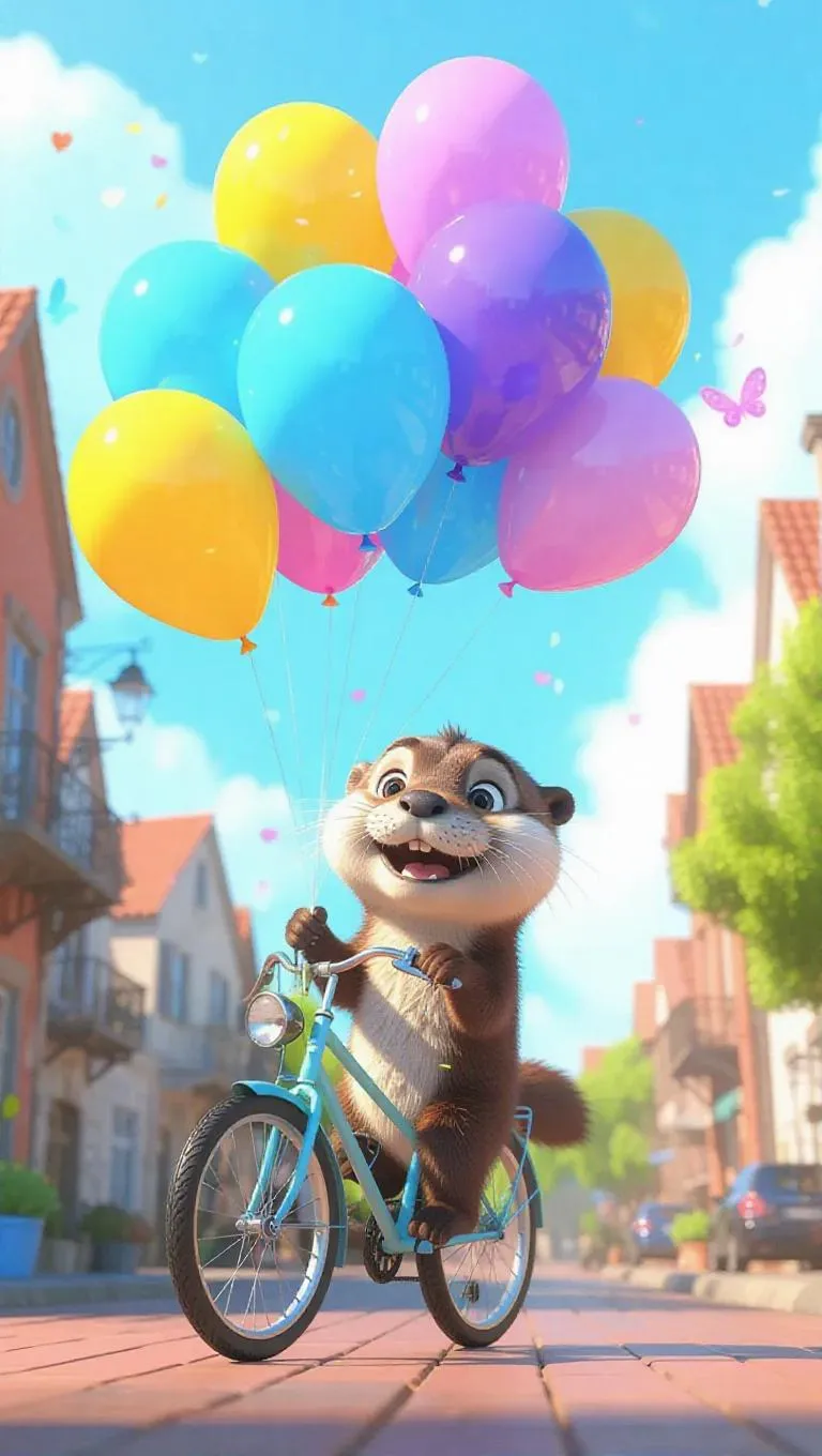 A cheerful cartoon scene featuring a cute otter selling colorful balloons from his bicycle, the balloons are bright yellow, sky blue, and violet, floating playfully above him, creating a whimsical and vibrant atmosphere.