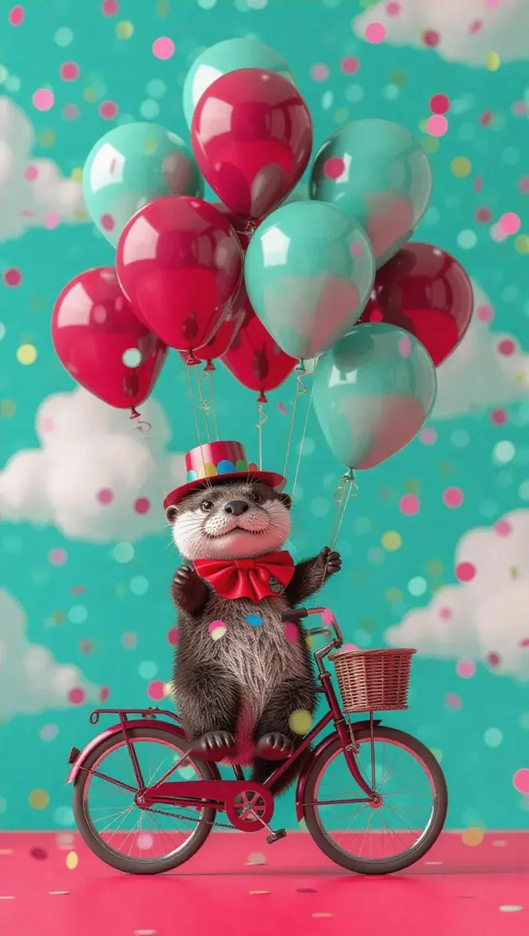A cheerful cartoon scene featuring a cute otter dressed as a clown selling colorful balloons from his bicycle, the balloons are maroon, seafoam, and platinum, floating playfully above him, creating a whimsical and vibrant atmosphere.