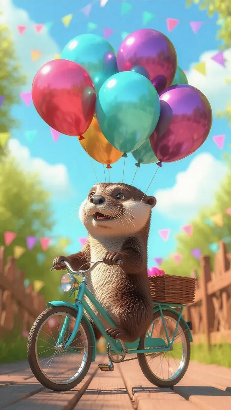A cheerful cartoon scene featuring a cute otter selling colorful balloons from his bicycle on a sunny day, the balloons are maroon, seafoam, and platinum, floating playfully above him, creating a whimsical and vibrant atmosphere.