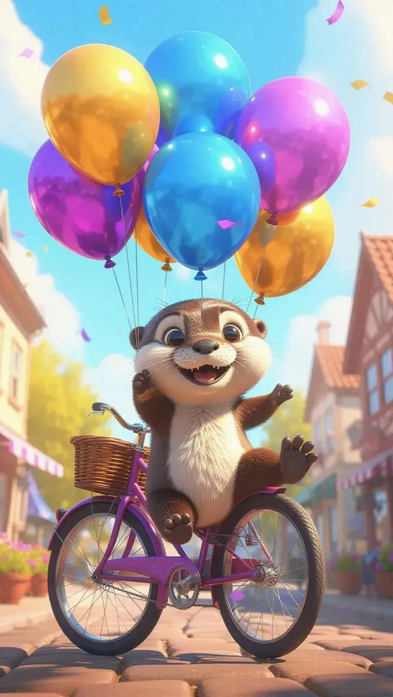 A cheerful cartoon scene featuring a cute otter selling colorful balloons from his bicycle, the balloons are blue, purple, and gold, floating playfully above him, creating a whimsical and vibrant atmosphere.