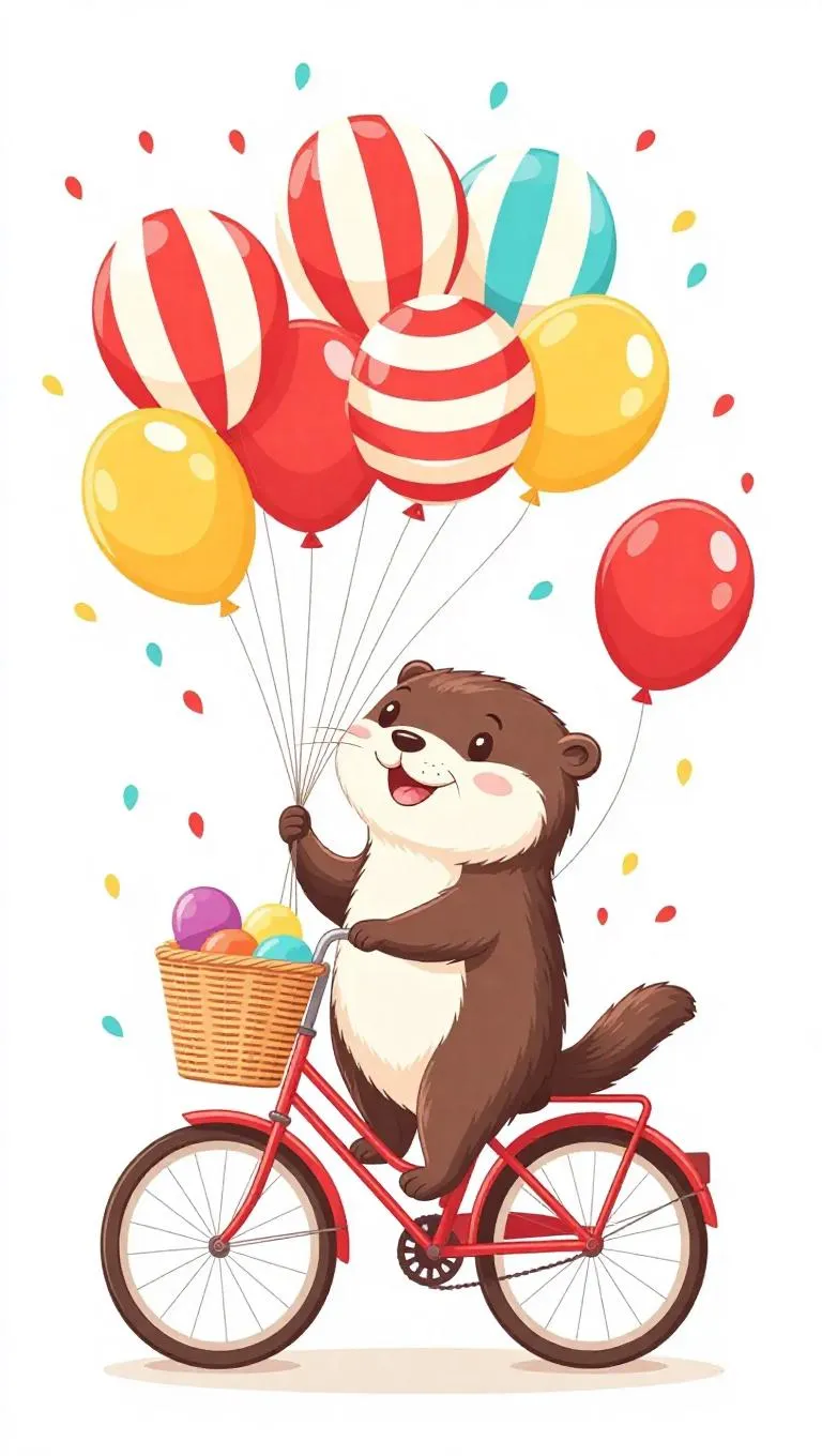 A cheerful cartoon scene featuring a cute otter selling colorful balloons from his bicycle, the balloons are in stripes of red and white, floating playfully above him, creating a whimsical and vibrant atmosphere.