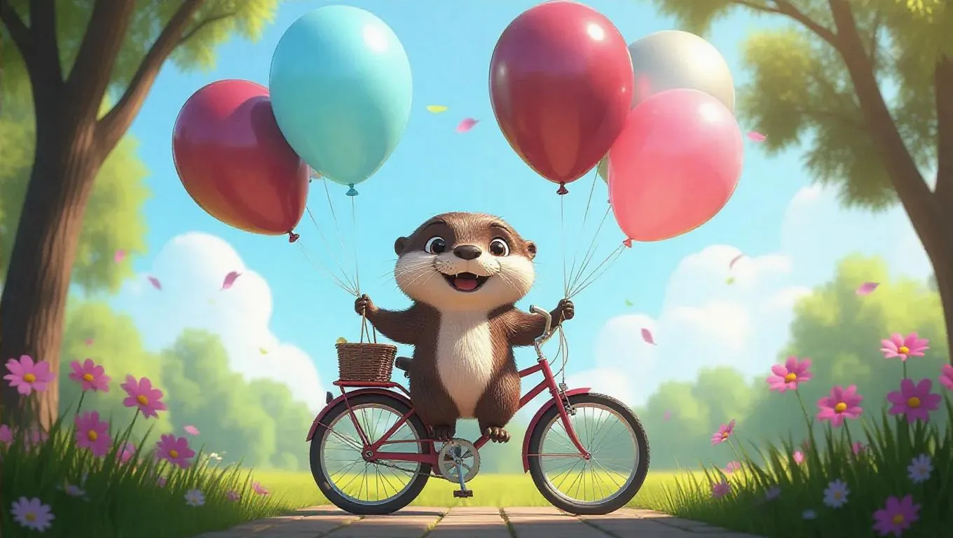 A cheerful cartoon scene featuring a cute otter selling colorful balloons from his bicycle in a park, the balloons are maroon, seafoam, and platinum, floating playfully above him, creating a whimsical and vibrant atmosphere.