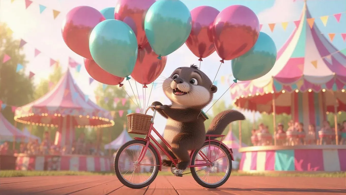 A cheerful cartoon scene featuring a cute otter selling colorful balloons from his bicycle at a carnival, the balloons are maroon, seafoam, and platinum, floating playfully above him, creating a whimsical and vibrant atmosphere.