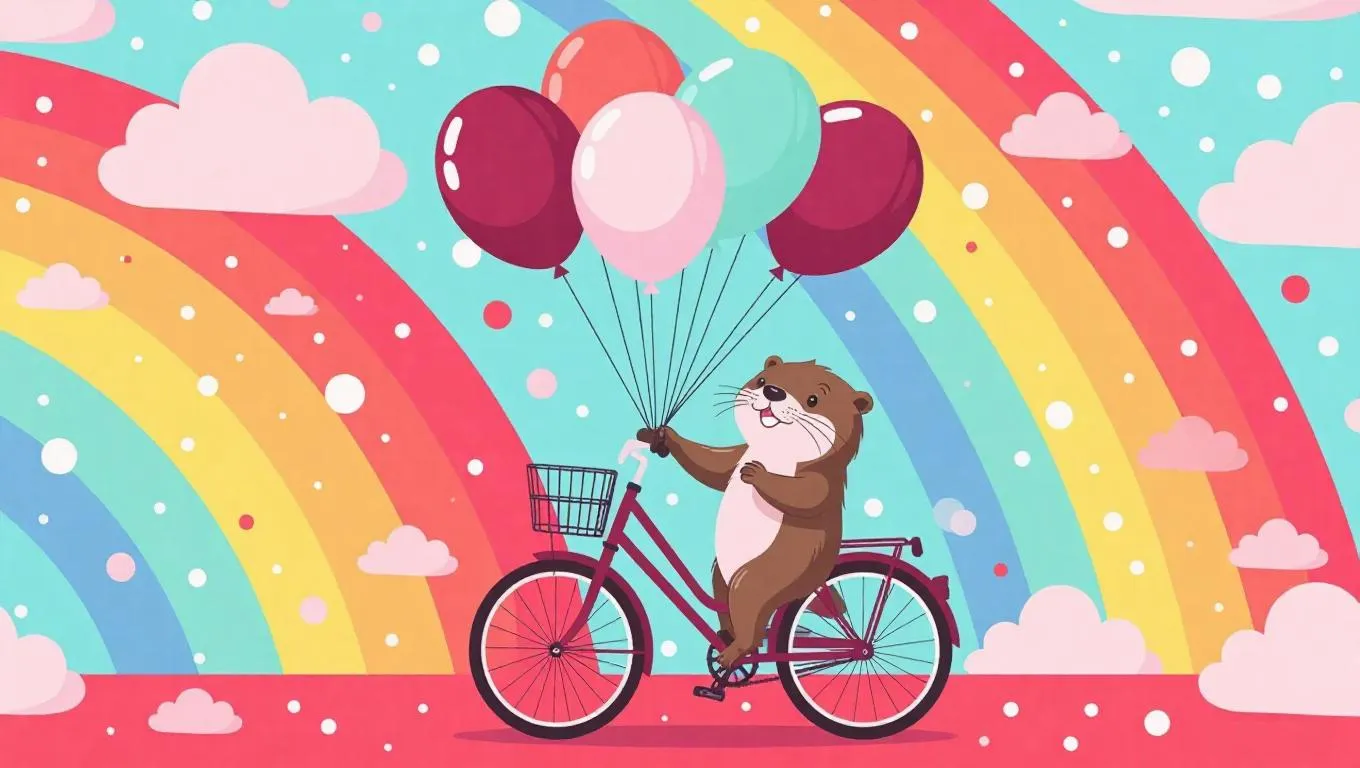 A cheerful cartoon scene featuring a cute otter selling colorful balloons from his bicycle, the balloons are maroon, seafoam, and platinum, floating playfully above a rainbow backdrop, creating a whimsical and vibrant atmosphere.