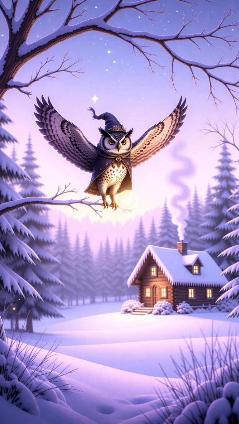 An inquisitive owl flies over a snowy meadow, clutching a luminous orb in its talons. The owl wears a tiny cloak and a feathered hat. Below, the forest is thick with snow, the branches sparkling with frost. In the background, a charming cabin bathes in a golden light, smoke rising lazily from the chimney. The sky is a calming lavender, with the stars starting to twinkle.