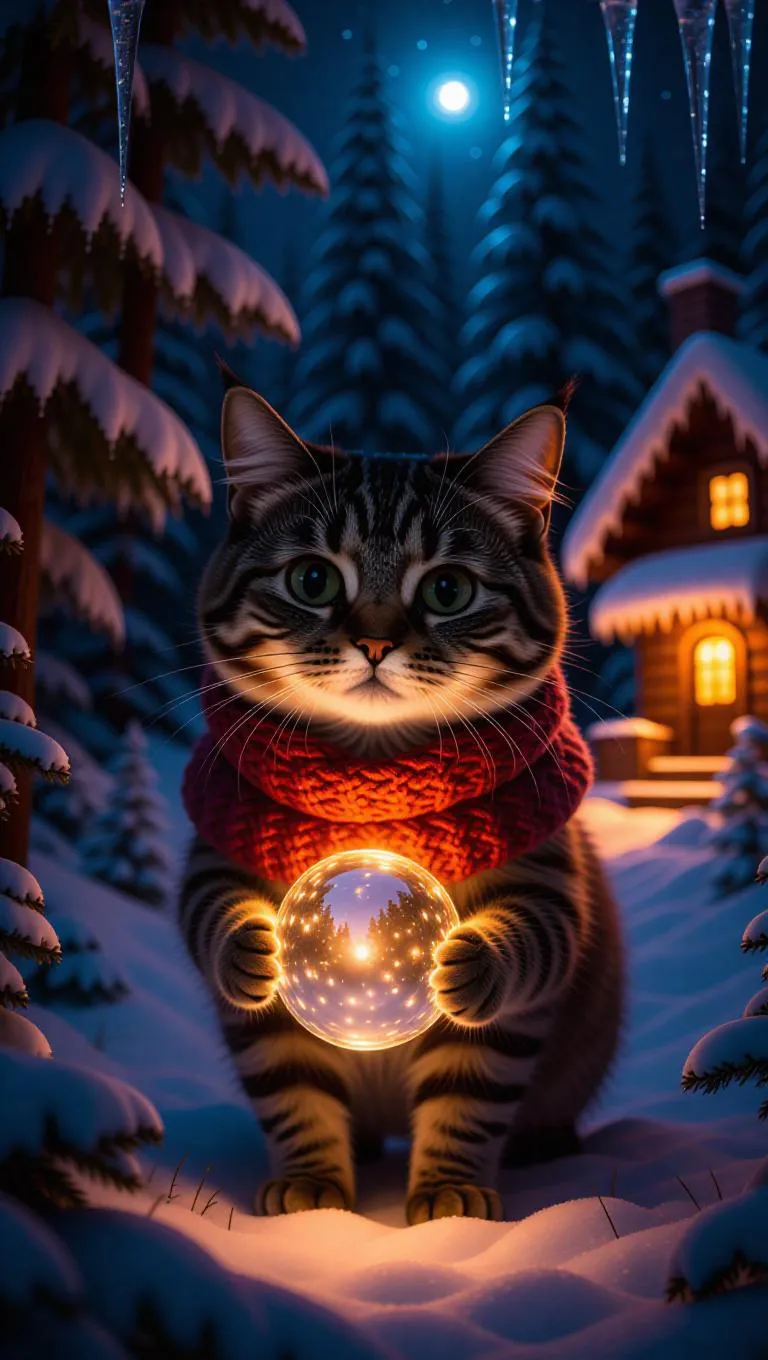 A brave cat explores a snowy forest, holding a glittering orb in its paws. The cat sports a cozy fur coat and a tiny scarf. Behind it, the snow-topped trees create a serene backdrop, with icicles glistening in the moonlight. In the distance, a quaint cabin beams softly from its windows, smoke rising quietly. The sky is a deep navy, with sparkling stars beginning to show.