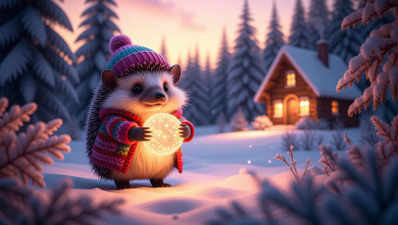 A quirky hedgehog waddles through a snowy field, holding a sparkling orb tightly in its claws. The hedgehog is snug in a colorful coat with a knitted hat. Behind it, the serene snow-cloaked forest surrounds, with glittering branches. In the distance, a charming cabin radiates a soft light, with smoke curling up. The sky is a warm peach, with early stars gleaming.
