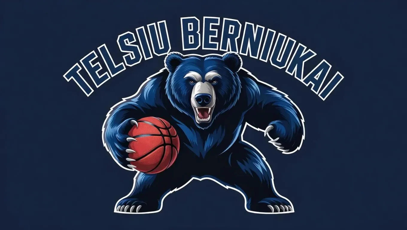 Design a fierce basketball team logo with dark blue and red hues, featuring a bold bear mascot and prominent "Telsiu Berniukai" text. Ideal for dynamic Lithuanian sports branding, combining strength, tradition, and modern aesthetics in a professional emblem for jerseys, merch, and team identity.