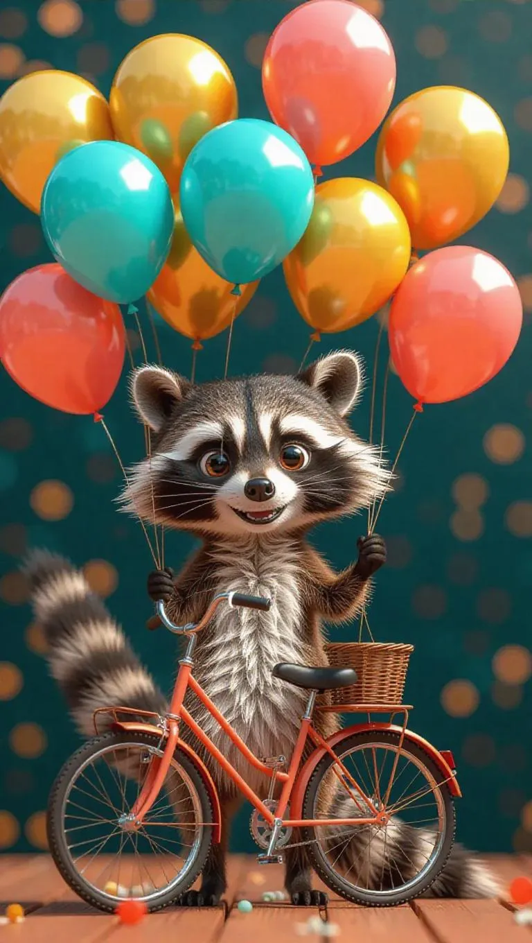 A cheerful cartoon scene featuring a friendly raccoon selling colorful balloons from his bicycle, the balloons are teal, coral, and gold, floating playfully above him, creating a whimsical and vibrant atmosphere