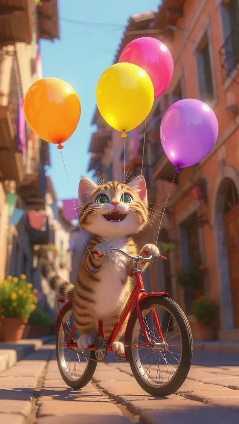 A cheerful cartoon scene featuring an excited kitten selling colorful balloons from his bicycle, the balloons are yellow, lavender, and crimson, floating playfully above him, creating a whimsical and vibrant atmosphere