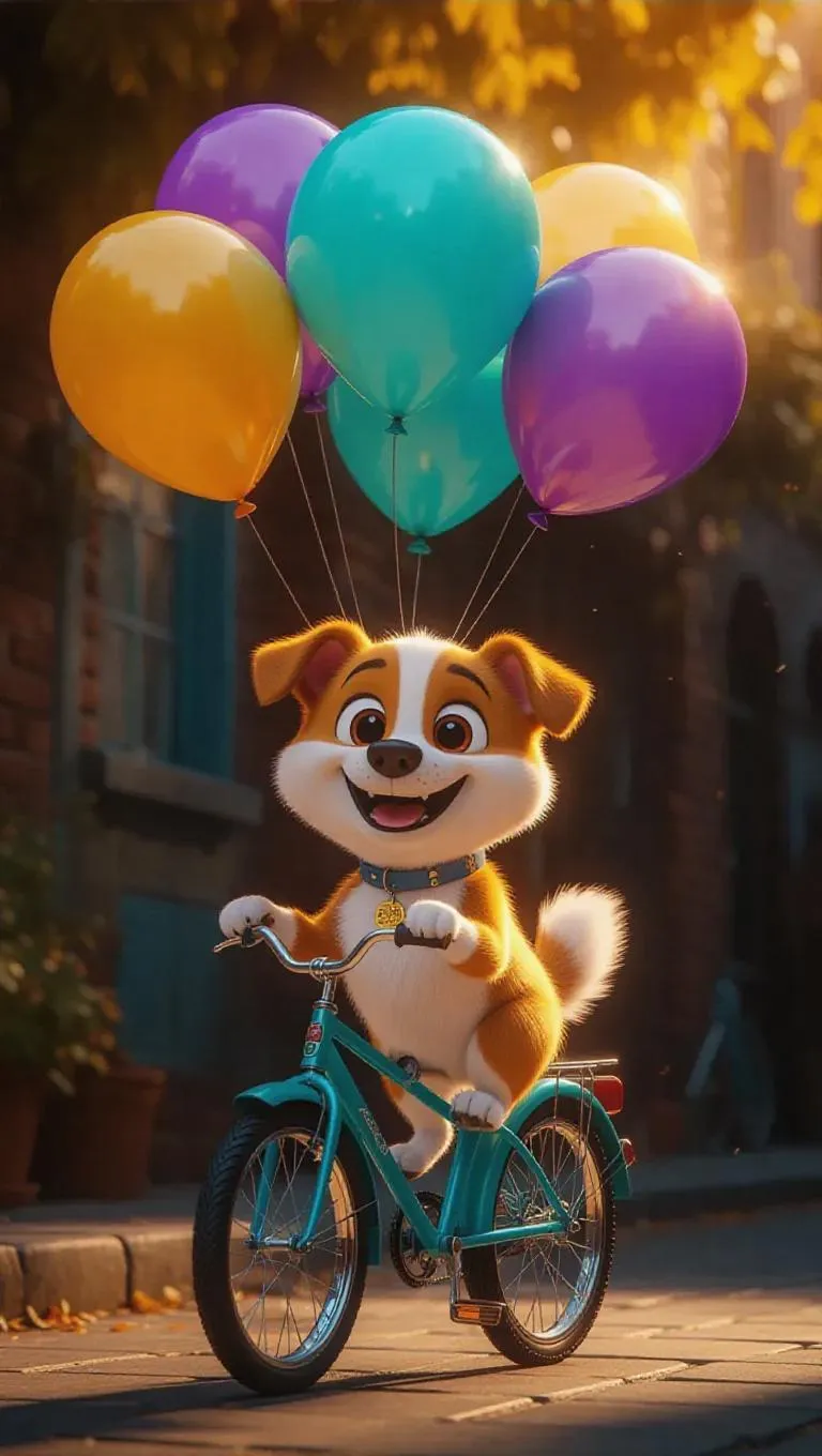 A cheerful cartoon scene featuring a lively dog selling colorful balloons from his bicycle, the balloons are golden yellow, aqua green, and lavender, floating playfully above him, creating a whimsical and vibrant atmosphere