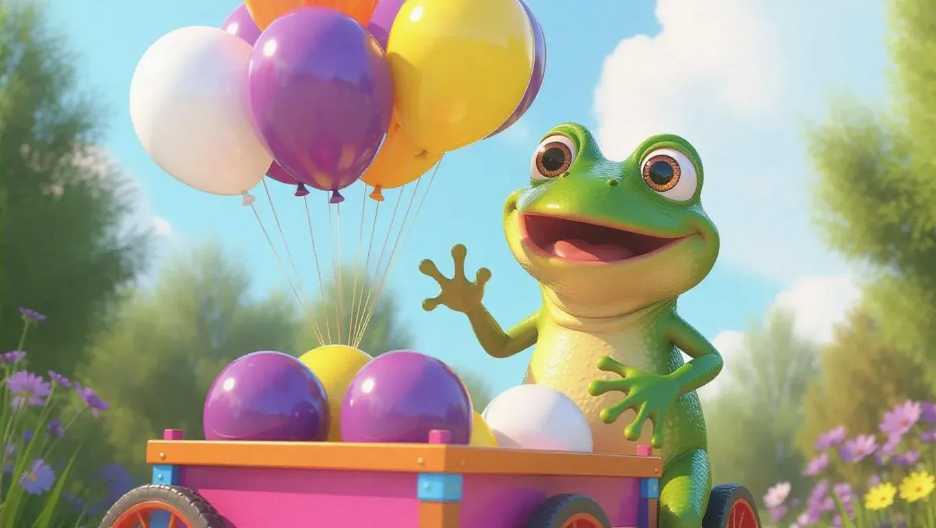 A cheerful cartoon scene featuring a smiling frog selling colorful balloons from a colorful cart, the balloons are white, violet, and lemon yellow, floating playfully above him, creating a whimsical and vibrant atmosphere