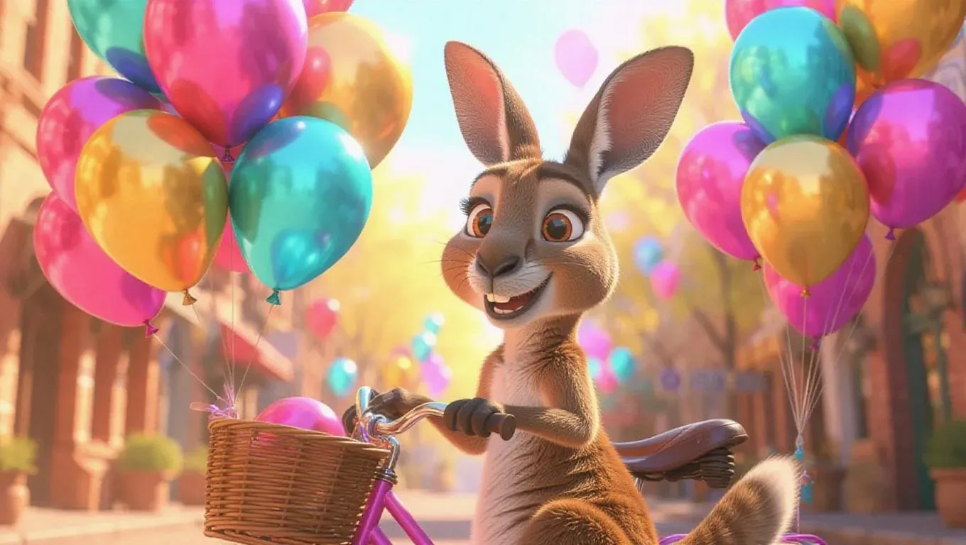 A cheerful cartoon scene featuring a bright-eyed kangaroo selling colorful balloons from her bicycle, the balloons are magenta, gold, and teal, floating playfully above her, creating a whimsical and vibrant atmosphere