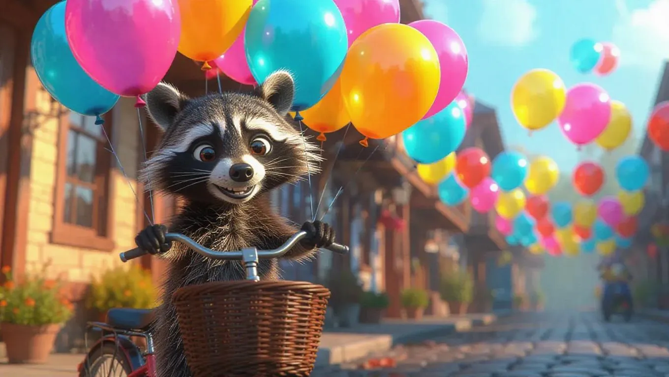 A cheerful cartoon scene featuring a mischievous raccoon selling colorful balloons from a bicycle with a basket, the balloons are raspberry, aqua, and bright yellow, floating playfully above him, creating a whimsical and vibrant atmosphere