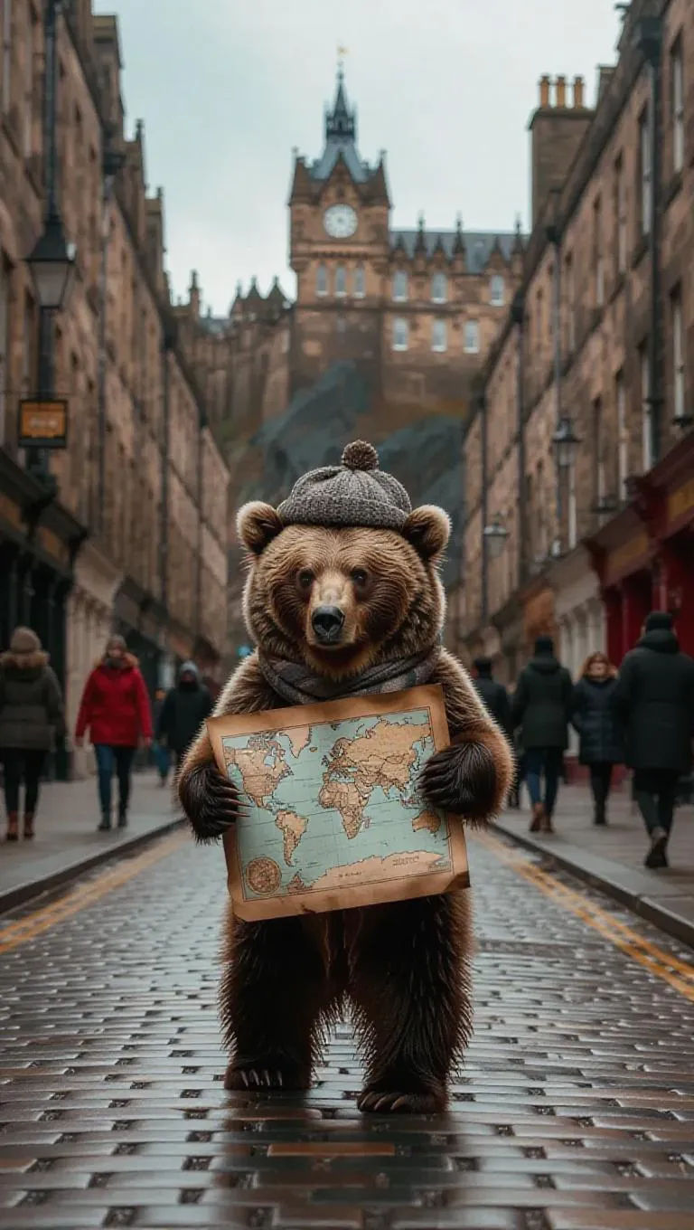 A wanderlust-filled bear ambles through the cobblestone streets of Edinburgh, Scotland, its large paws clutching an old map. The bear wears a tiny scarf and a woolen cap, its eyes filled with dreaminess. Around it, historic buildings and Baroque facades frame the street, their surfaces adorned with artwork. In the distance, the grand Edinburgh Castle towers magnificently, its outline vivid against the cloudy sky. The air is filled with the scent of spices and the sounds of street performers.