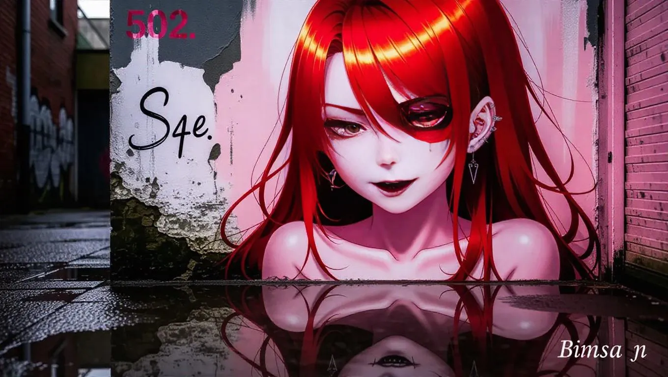 A weathered alley wall features a striking mural of a solitary anime girl with flame-red hair cascading over one eye, her pale skin contrasted by bold black lips and a subtle mole beneath half-lidded eyes. Cinematic lighting highlights her stud earrings and bare shoulders, accentuating her Glasgow smile and sharp fangs as reflective puddles below mirror her solemn expression. Soft greys and blush-pink tones blend into rain-dampened concrete, creating a dreamlike fusion of melancholy and romance through delicate linework and muted realism. The scene balances eerie elegance with nostalgic tenderness, merging urban decay with ethereal character details like chipped nail polish, smudged mascara, and wisps of hair catching unseen breezes.