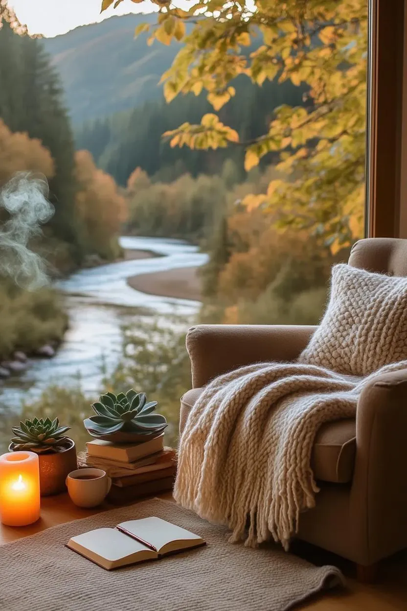 Generate serene self-care AI images blending tranquil indoor/outdoor scenes with earth tones. Features cozy reading nooks, calm riverside forests, yoga mats, herbal tea, and soft ambient lighting. Perfect mindfulness visuals with natural textures, plush fabrics, and peaceful details for meditation, relaxation, or digital wellness content creation using professional AI art tools.