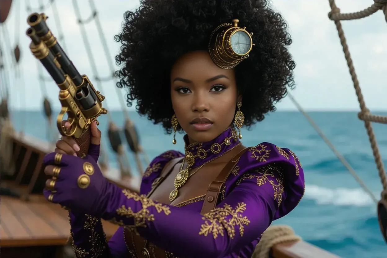 Create stunning AI-generated steampunk art with Vivago.ai. Featuring a powerful Afro woman with dark skin, golden steampunk gun, and purple ornaments aboard a pirate ship. Realistic style, detailed sea backdrop. Transform prompts into professional visuals.