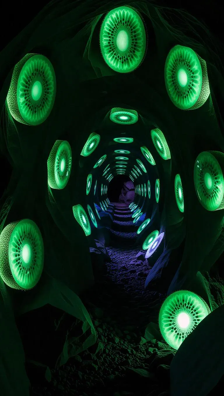 Underground caverns of translucent kiwi stone, walls shimmering with emerald green and radiant black seeds, each seed humming softly and glowing, resonating with ancient songs, travelers who sleep here awaken with the ability to taste emotions, surrounded by mystical bioluminescence.