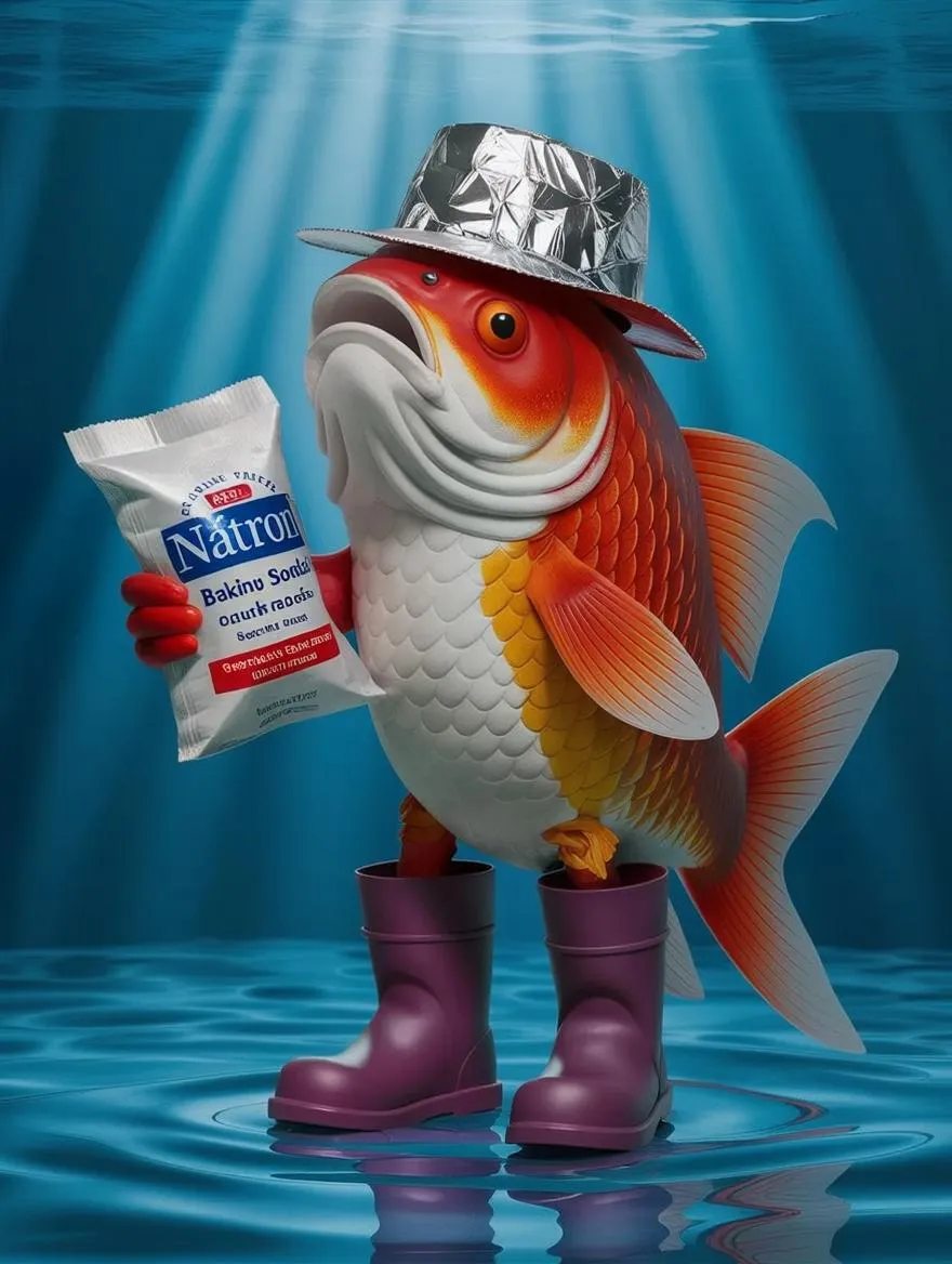 A surreal koi carp standing upright, holding a bag of baking soda with the Word "Natron" in one fin, wearing two rubber boots, and a shiny aluminum foil hat on its head highly detailed, whimsical, fantasy illustration, vibrant colors, 4k, studio lighting, sharp focus
