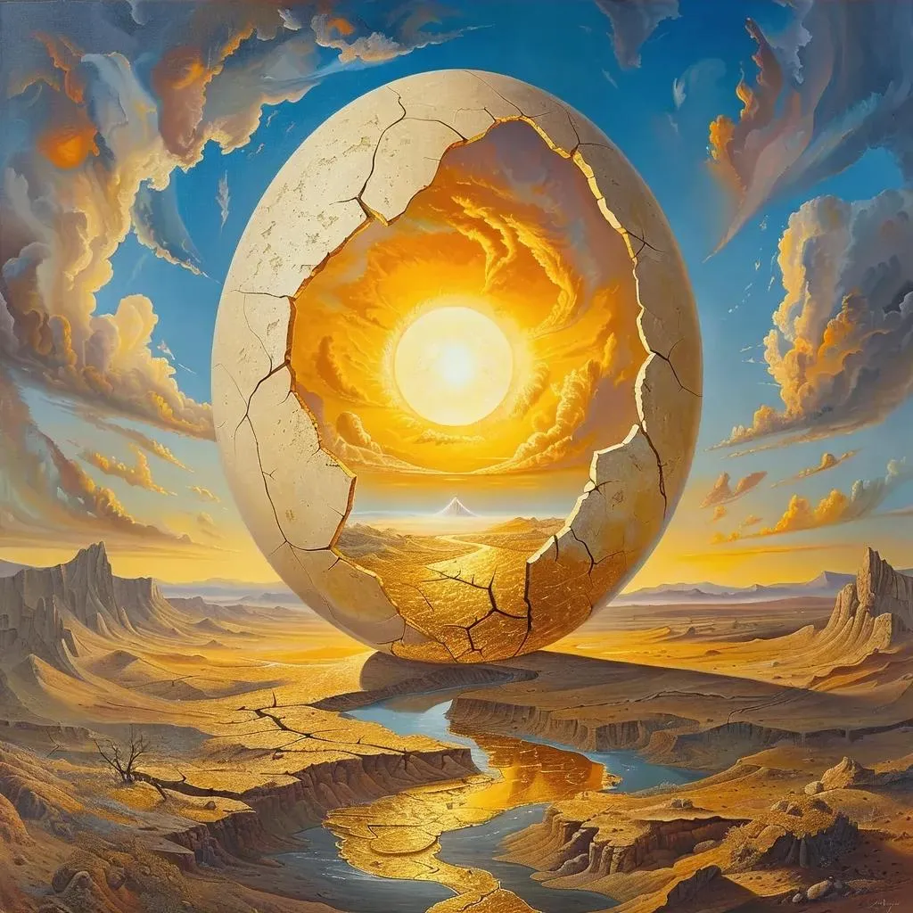 Create AI-generated surreal landscapes with a giant cracked egg cradling the sun, dramatic skies, and vivid painterly textures. Inspired by Salvador Dali, this mystical fantasy scene blends symbolic dawn imagery with ethereal light for dreamlike, otherworldly visuals. Perfect for crafting symbolic, Dali-esque art using vivago.ai's AI image tools.