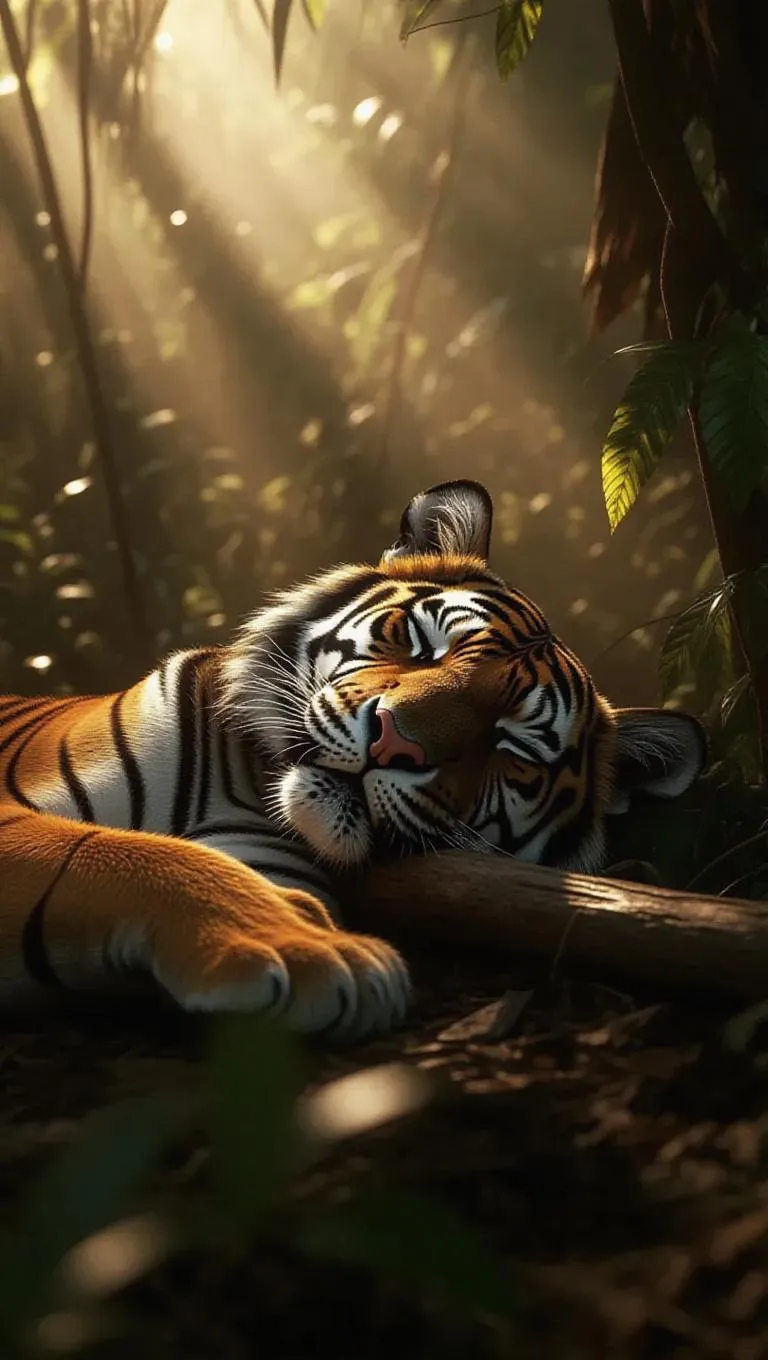 Capture a cinematic scene of an unconscious majestic tiger in a dense tropical jungle, bathed in golden morning light. Realistic fur textures, dramatic shadows, glowing dust particles, and depth of field enhance the high-quality realism. Perfect for AI-generated visuals with 9:16 aspect ratio, blending tension, vulnerability, and lush forest atmosphere for striking image/video projects.