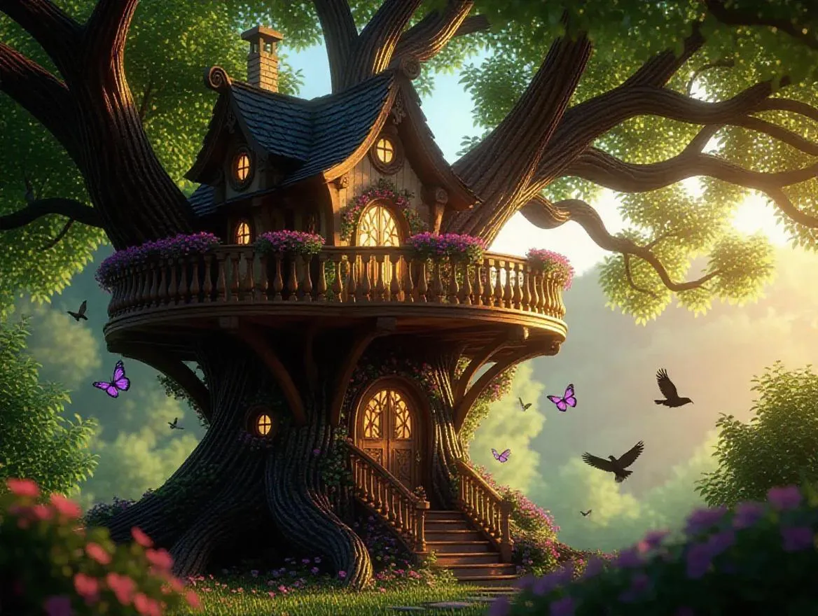 Discover a vibrant fantasy treehouse nestled in a lush magical forest. This enchanting fairytale dwelling features ornate balconies, blooming flowers, and majestic trees under golden sunlight. Experience joyful serenity with fluttering birds, dancing butterflies, and springtime magic in this whimsical AI-generated scene.
