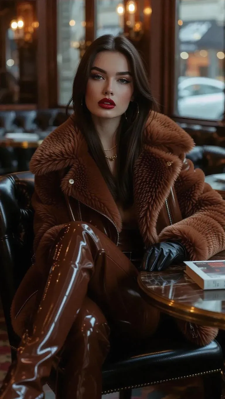 Elevate your visuals with AI-generated high-fashion imagery. Discover urban sophistication through a slim, dark brunette model in patent brown leather, exuding elegance in a chic modern restaurant. Featuring minimalist decor, Chanel accessories, and soft lighting, this prompt crafts sleek, polished visuals with high-fashion flair. Perfect for creating sophisticated, refined ambiance in AI-powered image generation.