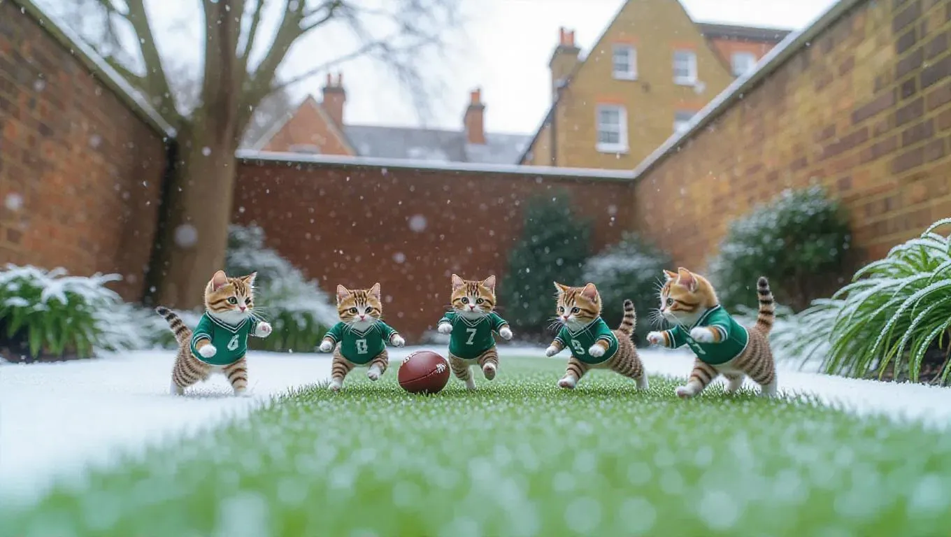 A whimsical scene of miniature cats playing football in a lush garden during a gentle snowfall in London. The cats are dressed in tiny football jerseys, energetically chasing a small ball. Snowflakes are falling softly, covering the grass and plants with a light dusting of snow. The garden is surrounded by charming old brick walls and leafless trees, giving a cozy winter vibe. The perspective is a medium shot, capturing the playful action of the cats. The lighting is soft and diffused, with a slightly cool tone to emphasize the winter atmosphere. The art style is realistic with a touch of fantasy, making the scene both believable and enchanting.
