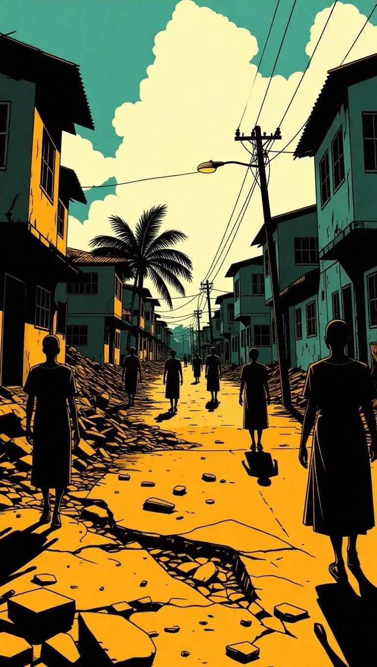 Generate AI comic book art of Congo urban devastation: collapsed roads, ruined schools, dim-lit abandoned hospital. Depict Congolese citizens' despair with vivid facial expressions using AI image tools. Sharp shadows, gritty textures, and bold contrasts amplify the dramatic post-crisis atmosphere. Create striking visual narratives with Vivago.ai's comic-style AI effects.