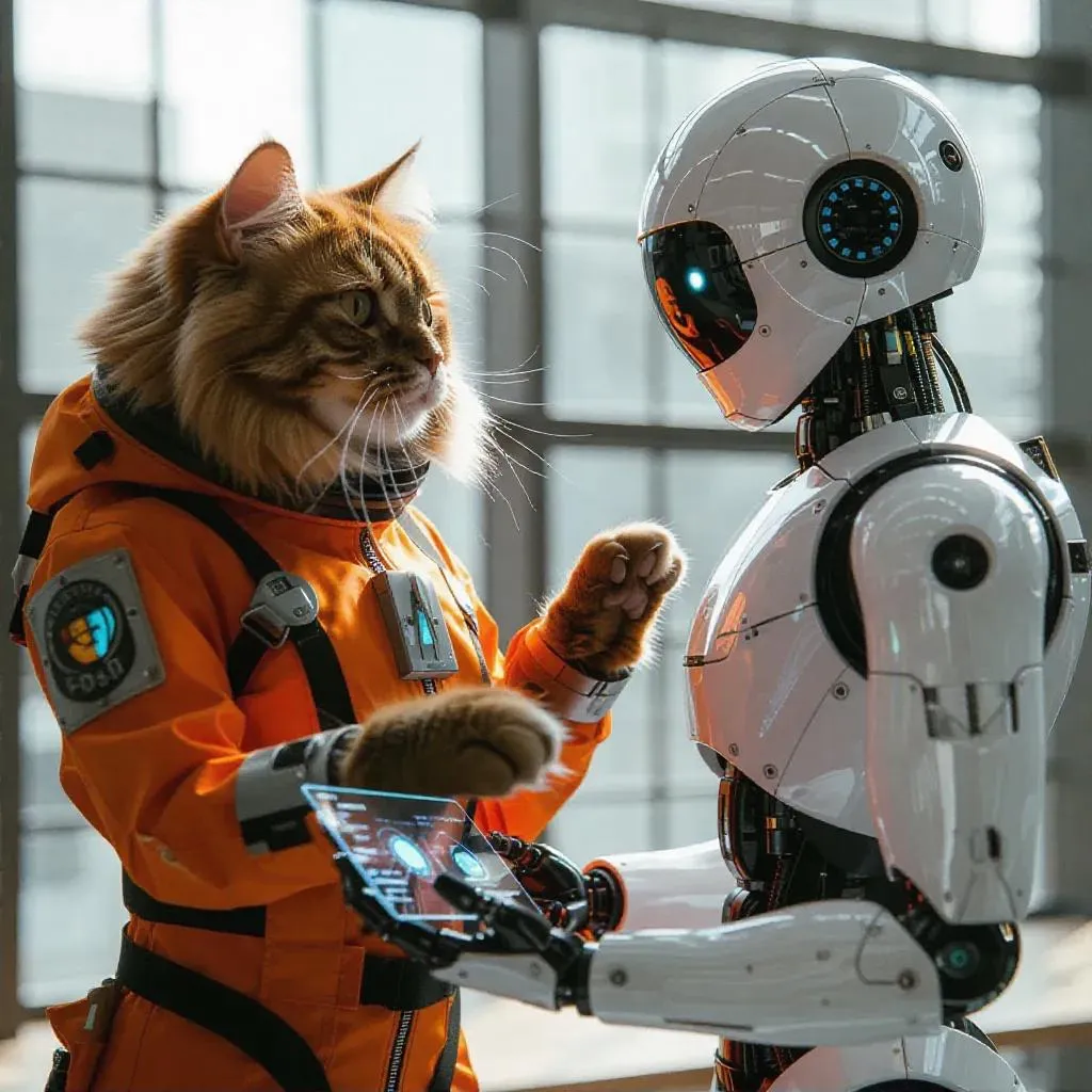 Experience AI-generated visuals of a futuristic scene featuring an anthropomorphic red cat in a space suit interacting with a holographic interface alongside a sleek humanoid robot. Set in a modern office with natural lighting, this dynamic composition showcases cutting-edge AI creativity for professional-grade digital art and innovative visual storytelling.