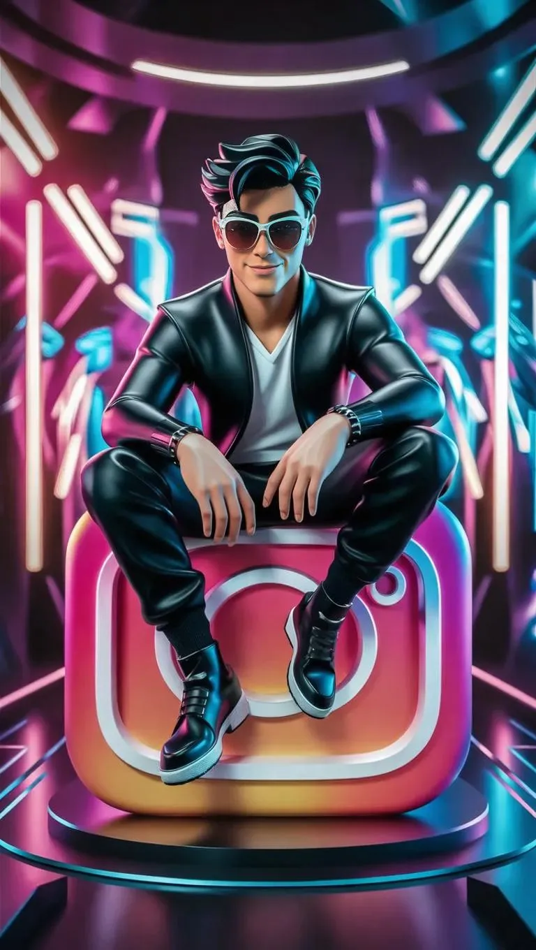 Create striking AI-generated 3D art of a futuristic warrior character in a black gaban and white Ray-Ban sunglasses, lounging on the Instagram logo. Perfect for edgy digital designs, social media visuals, or modern animation projects. Elevate your content with AI-powered creativity.
