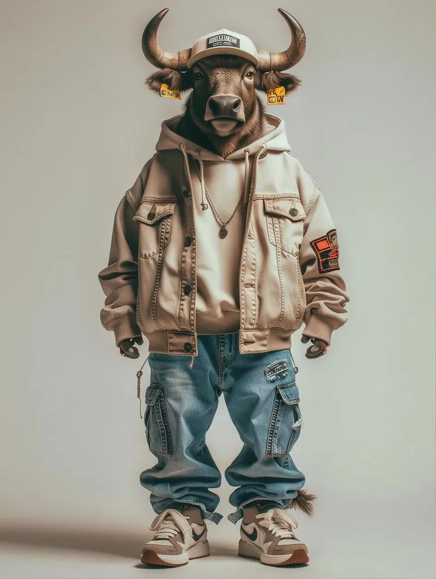 Generate an anthropomorphic ox in streetwear standing on two legs. Create hyperrealistic AI-generated images of this full-length character with a neutral background. Explore Vivago.ai to transform text prompts into professional visuals.