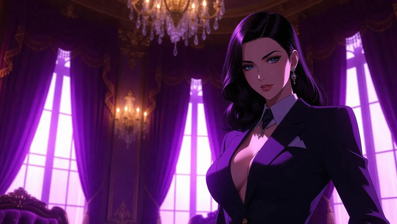 Fantasy realm, animated anime, captivating mafia boss woman, exuding confidence and allure, adorned in a sophisticated, tailored suit, standing in a dimly lit, opulent room with velvet curtains and ornate chandeliers, her eyes glinting with a mix of power and mystery, married, with a subtle wedding band on her finger.