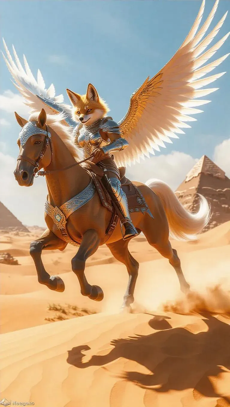AI-generated anthropomorphic golden fox rides a biomechanical Pegasus across Sahara dunes. Octane rendering highlights lustrous fur, dynamic tails, metallic wings with intricate gears. Desert heatwaves blend with pyramid silhouettes, merging fantasy and reality. Ultra-detailed sand textures, realistic lighting, and lifelike motion capture surreal, professional-grade visuals.