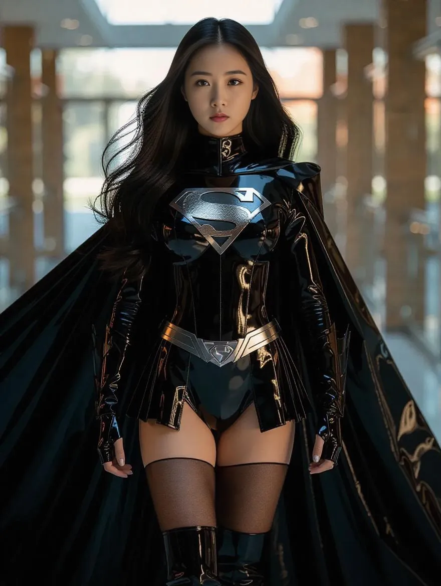 Generate AI-powered visuals of a dark superheroine in 4K HDR: 360° view of a 28-year-old Chinese university student transformed into an evil Kryptonian-inspired villainess. Detailed black pleather bodysuit, silver S-logo chestplate, knee-high boots, and flowing cape mid-flight. Cinematic aerial dynamics with 120° cape spread, seamless textures, and modern campus backdrop – distortion-free rendering at 60fps.
