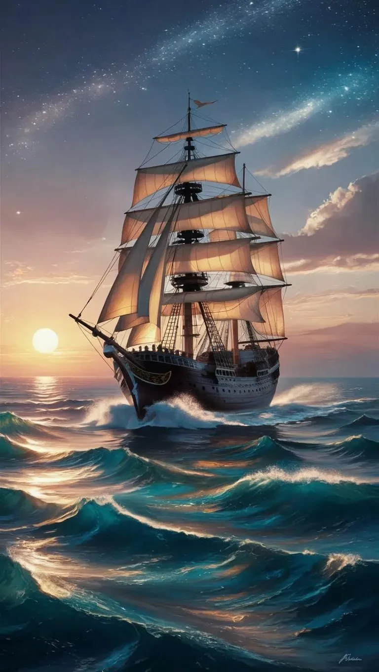 Capture a hyperrealistic scene of a ship sailing into a golden sunset, sails billowing against azure waves under a starry twilight sky. AI-generated visuals mirror lifelike details—sunlit ocean glow, wind dynamics, and celestial transitions—perfect for vivid storytelling. Elevate maritime adventures with vivago.ai’s realistic AI effects for professional-grade imagery.