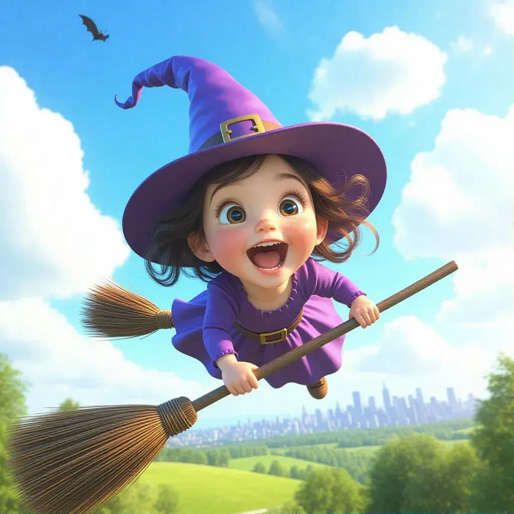 Experience a realistic, enchanting AI-generated image of a joyful toddler witch with an excited expression, soaring on a broomstick in a vibrant hat. Serene landscape with lush greenery, distant city skyline, and fluffy clouds in a bright, cheerful palette. Captures magical, playful moments.