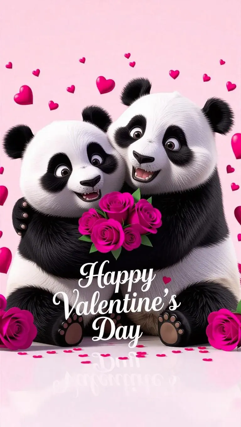 Generate charming AI Valentine's Day art with hugging Pixar-style pandas holding roses. Featuring 3D C4D rendering, bubbly mat textures, light pink gradients, and clean backgrounds. Add elegant "Happy Valentine's Day" text to professional-grade romantic visuals. Create love-filled scenes effortlessly using VivaGo.ai's AI image generator.