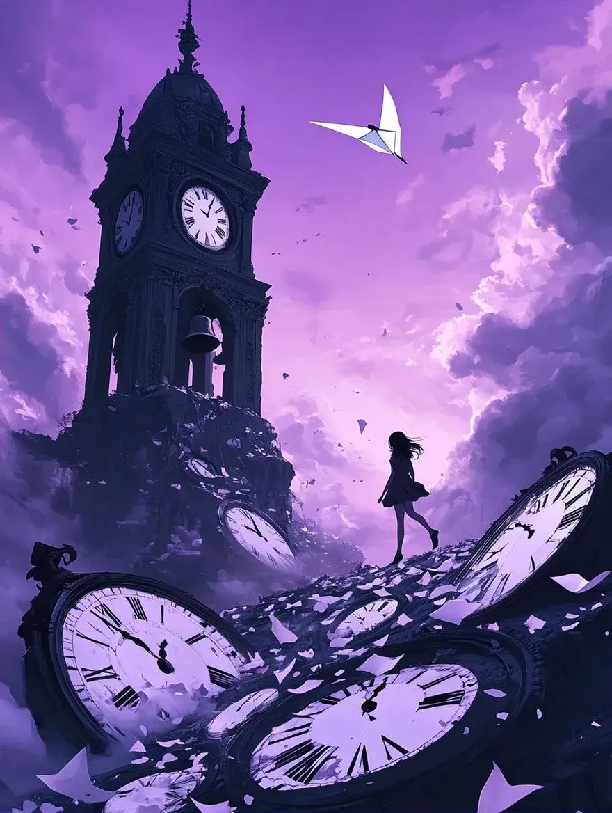 Create stunning AI-generated anime art with vivago.ai. Explore a surreal sky island where time stands still—broken clocks, scattered gears like flowers, and a paper bird atop a violet-hued Gothic bell tower. Perfect for Gothic-fantasy lovers seeking intricate architectural details and timeless, ethereal visuals.