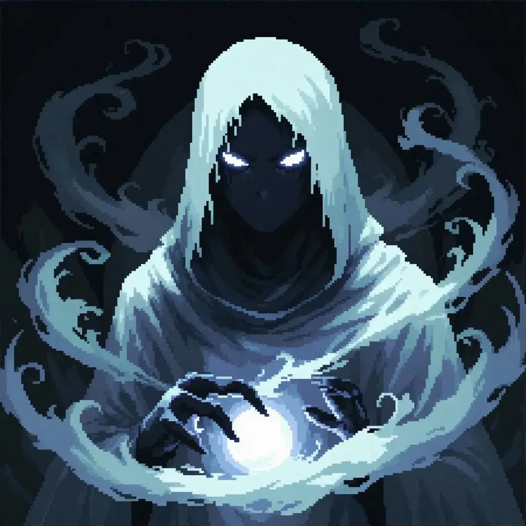 Light pixel art style, Accused Fell Spirit with ghostly-white and eerie gray color palette, haunting eyes glowing faintly, surrounded by swirling mist, set against a dark, moody backdrop, exuding an otherworldly presence.
