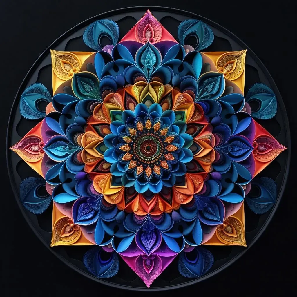 Generate mesmerizing AI-powered mandala art with 4D concentric patterns and vivid spectral hues. Create intricate designs on a sleek black matte backdrop using VivaGo.ai's advanced tools for stunning, professional-grade visuals. Perfect for digital artists and designers seeking vibrant, dimensional AI-generated artwork. Explore endless creativity today!