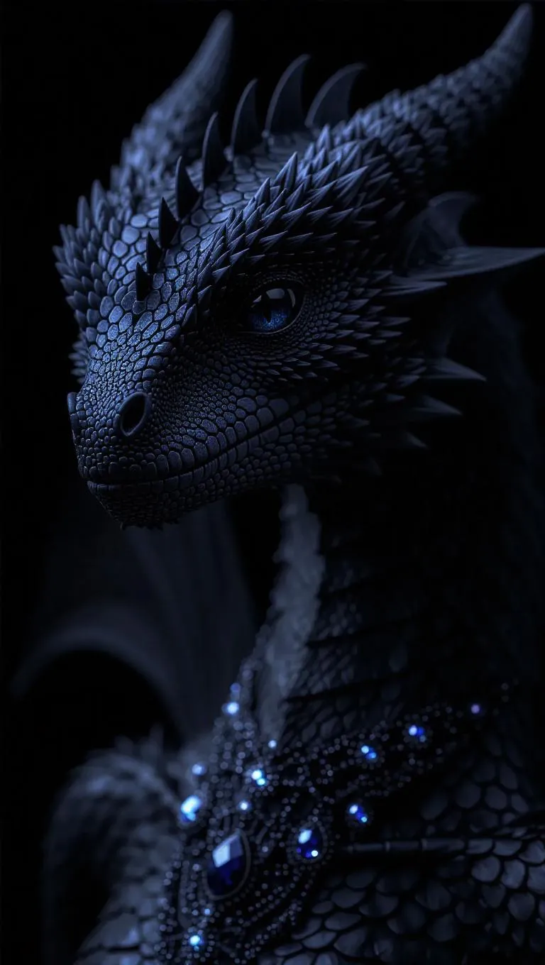 Create stunning AI art of a dark celestial female dragon with galaxy-black skin, hyper-realistic onyx eyes, and intricate cosmic jewelry. Featuring delicate wings, cinematic lighting, and a void backdrop, this masterpiece blends fantasy detail, dynamic composition, and ornate elegance for a mesmerizing, professional-grade visual experience.
