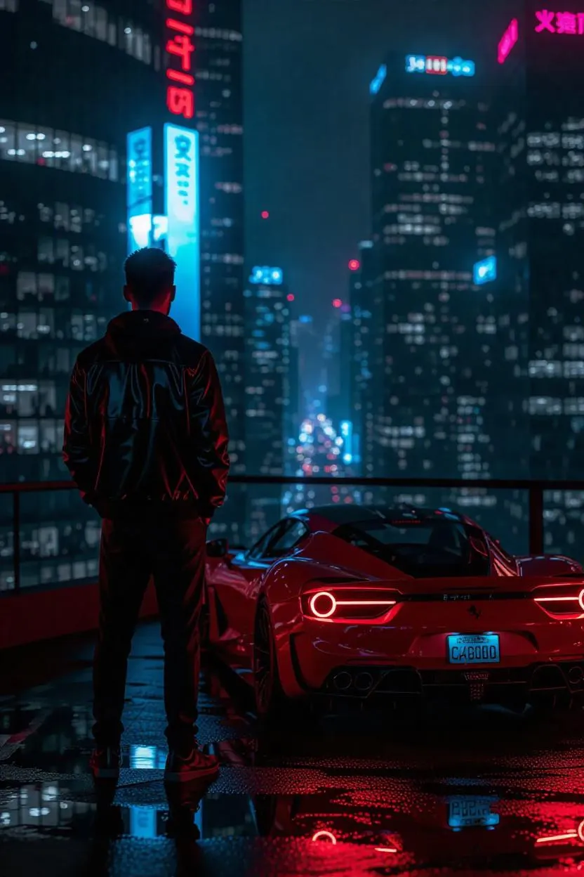 A confident young man stands on the rooftop of a luxury high-rise, hands in pockets, overlooking a neon-lit city at night, a sleek sports car parked nearby, gentle breeze, sense of freedom and personal success, cinematic GTA-style atmosphere, highly detailed, portrait 2:3, vibrant cityscape, dynamic lighting, urban flair, modern elegance.