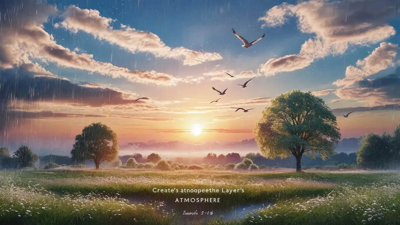 Generate a vibrant 3D realistic Earth visualization with atmospheric layers, sunset hues, soaring birds, and dynamic clouds. Capture tranquil winds, distant light rain, snowfall, and fertile landscapes echoing Isaiah's biblical water symbolism. Highlight lush greenery, swaying trees, and serene yet lively ambiance for SEO-rich, immersive AI-powered imagery.