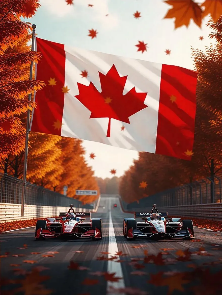 Create epic cinematic Canadian motorsport scenes with AI. Generate patriotic art featuring the maple leaf flag behind autumn trees, Circuit Gilles Villeneuve, futuristic open-wheel race cars on wide tracks, and falling leaves. Perfect AI image generation for futuristic racing and dynamic landscapes. Explore creative tools for professional results.
