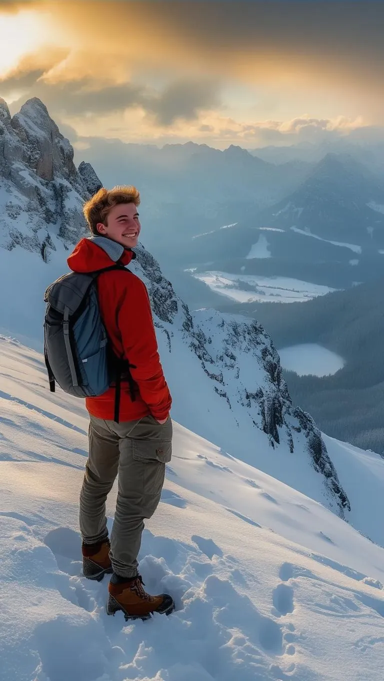 Create AI-generated visuals of a young man smiling on a snowy mountain peak with HDR effect. Experience realistic details, crisp snowscapes, and dramatic skies for professional-grade outdoor adventure scenes. Elevate your content with vivid, lifelike imagery powered by advanced AI effects.