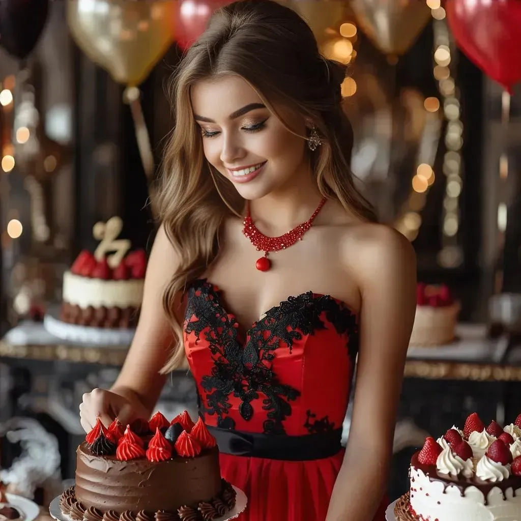 Create stunning AI-generated realistic images of a fashionable 27-year-old woman in a red-black dress, celebrating her birthday party. Featuring intricate details like a red pendant, gentle smile, forehead birthmark, and a chocolate cake-cutting moment. Perfect for personalized party visuals with effortless AI creativity.
